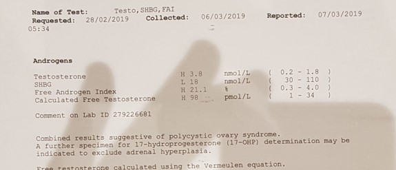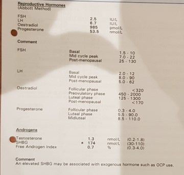 This set of results is from a blood test. Here we’re looking at FHS (follicle-stimulating hormone, the hormone that stimulates the growth of the ovarian follicles and egg) and LH (luteinising hormone, the hormone that triggers ovulation). This test would have been done at the beginning of the cycle on the 2nd or 3rd day of the period. At this part of the cycle, the LH and FHS should be more or less equal, but here we see the LH much higher than the FHS. This can be a sign of PCOS and excess male sex hormone production because excess LH can trigger the ovaries to make extra testosterone.