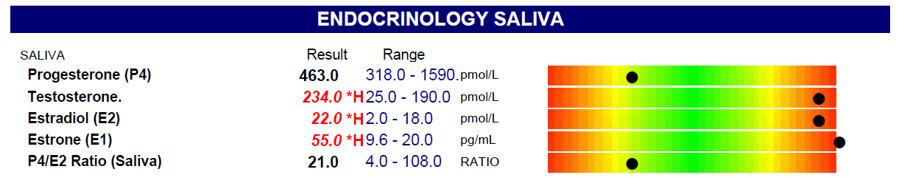 In this next chart, we’ve got high testosterone, low progesterone and high estrogen. You can see the progesterone is not out of range, but it’s sitting down the bottom end. This test was done 21 days from the start of a period and at this point in the cycle, progesterone should be at the upper end, not the lower end, of the range.