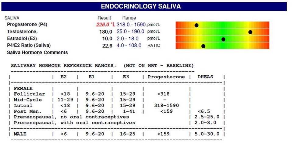 In this example here, what we can see is the testosterone is high. It should be 100 but it’s up over 200, so that’s double the amount of testosterone. Also, you can see progesterone’s on the lower side as well. This combination of low female hormone and high male sex hormone spells trouble for your skin because it’s going to trigger excess oil production, particularly in the week before a period.